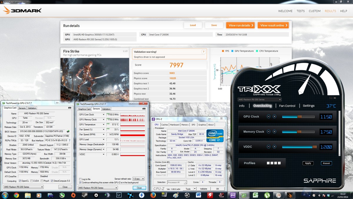 Andiamo ora a vedere come si comporta questa scheda in overclock. L’overclock, per chi non lo sapesse, consiste nel perseguire il miglioramento delle prestazioni di un componente elettronico di un elaboratore (in genere una CPU) mediante l'aumento della frequenza di clock rispetto a quella prevista dal produttore. Segnaliamo che purtroppo questa scheda a differenza della 280X Toxic ha il voltaggio bloccato a 1.200V, ciò ci ha limitato un bel po’ nella parte overclock nella quale abbiamo ottenuto le seguenti frequenze: +50MHz per il core e +250MHz per le memorie. Con tali frequenze abbiamo chiuso di nuovo il 3DMark 2013 ottenendo il seguente punteggio: