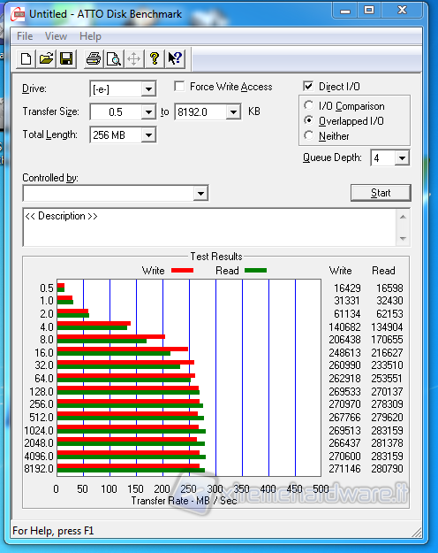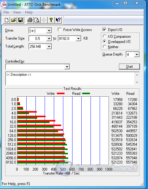 ATTO è un benchmark gratuito che esegue dei semplici test sia di scrittura sia di lettura in modalità sequenziale, adoperando una Queue Depth (file in coda) di 4. In questo test possiamo immediatamente vedere che i risultati ricalcano quasi fedelmente quanto dichiarato da OCZ, e anzi risultano anche leggermente superiori.