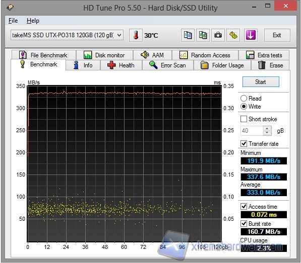 HD Tune è un'utility per Hard disks e SSDs con molte funzioni, può essere utilizzato per misurare in modo accurato le performance del drive, per trovare errori, per controllare lo stato vitale del drive, per cancellare dati in modo sicuro e molto altro ancora. La versione da noi utilizzata è l'ultima disponibile al momento e si tratta della 5.50. Il programma è disponibile in due versioni, una freeware (HD Tune) e una a pagamento (HD Tune PRO), nel nostro caso è stato necessario utilizzare la versione PRO in quanto è l'unica a misurare le prestazioni del drive in scrittura.