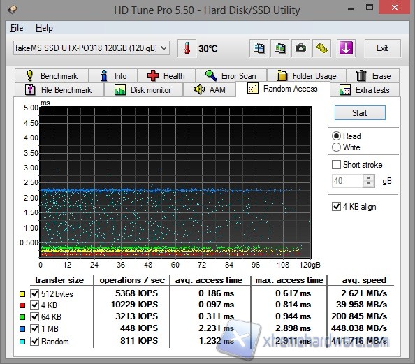Le IOPS in scrittura per i file di tipo 4K risultano davvero basse non riuscendo a superare né in scrittura né in lettura i 15.000 IOPS e posizioando l’unità nella fascia bassa della classifica a dispetto del precedente modello UTX-2200.