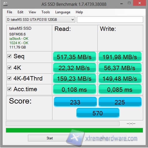 AS SSD Benchmark è un'altro benchmark gratuito studiato appositamente per SSD, effettua i suoi test sintetici senza adoperare la cache del sistema operativo che va ad influenzare pesantemente i risultati del Tranfer Rate, inoltre determina i tempi di accesso del drive sfruttando l'intera capacità del drive stesso, tutti i test vengono effettuati utilizzando dati non comprimibili.